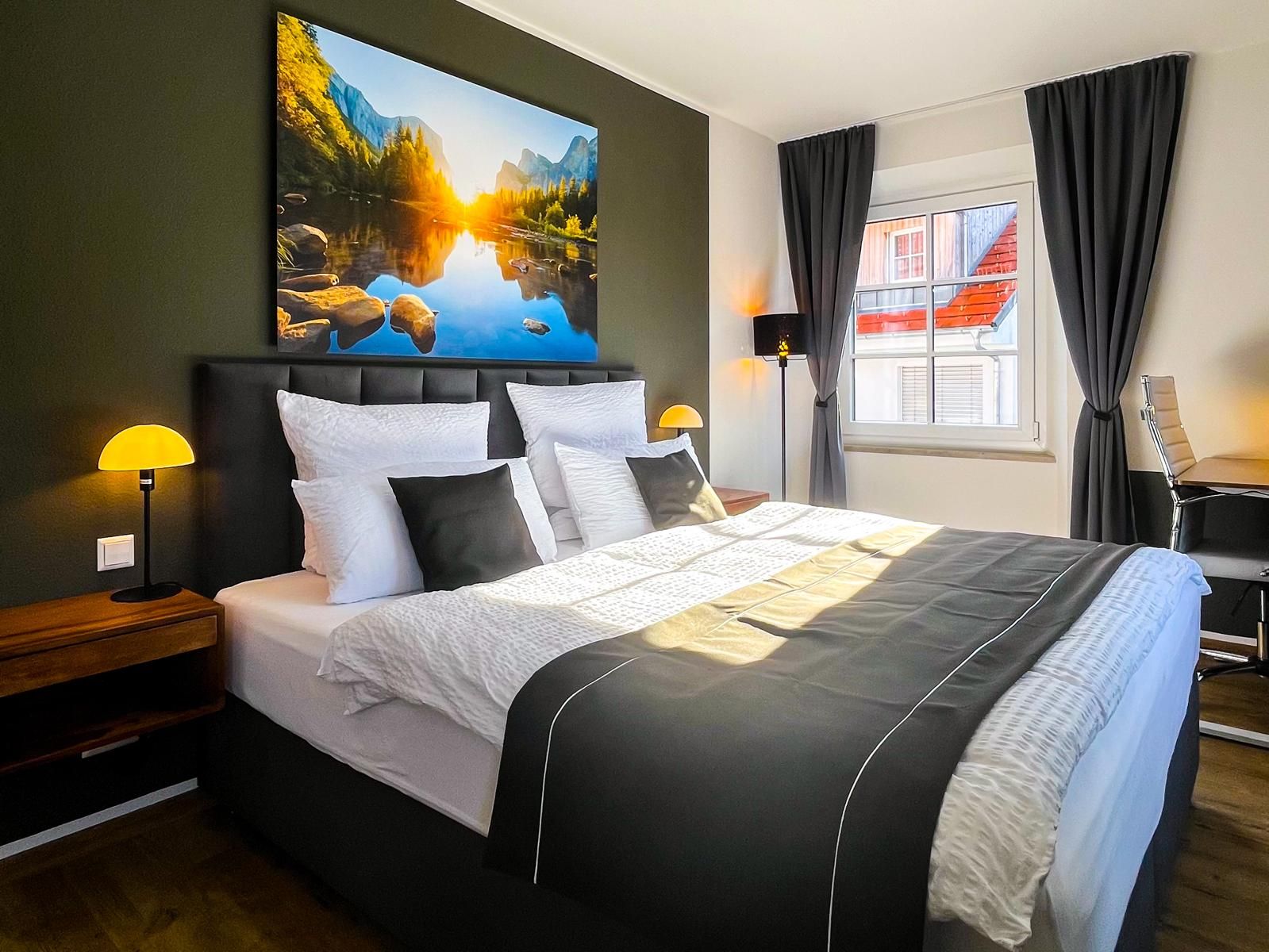 The apartment is located on the second floor of a listed building from 1841 in the heart of Isny. It has been furnished with great attention to detail to ensure you have a pleasant time. The two bedrooms provide sleeping space for a total of 6 people. All meals can be prepared in the fully equipped kitchen with a large hob, oven, dishwasher, fridge/freezer and coffee machine. There is plenty of space to relax in the spacious living and dining area. Make yourself comfortable on the large sofa, enjoy a movie or end the day with a glass of wine. The modern bathroom has a refreshing shower, a relaxing bathtub and a washing machine. For those who need to get some work done on vacation or want to network digitally, we have set up a comfortable workspace with a height-adjustable desk and fast WiFi. For your comfort: Dog-friendly: Your four-legged friend is just as welcome here as you are! Parking spaces: Two private parking spaces right next to the apartment are available free of charge. Bicycles: If you are traveling by bike, you will find a secure parking space for your bicycles.